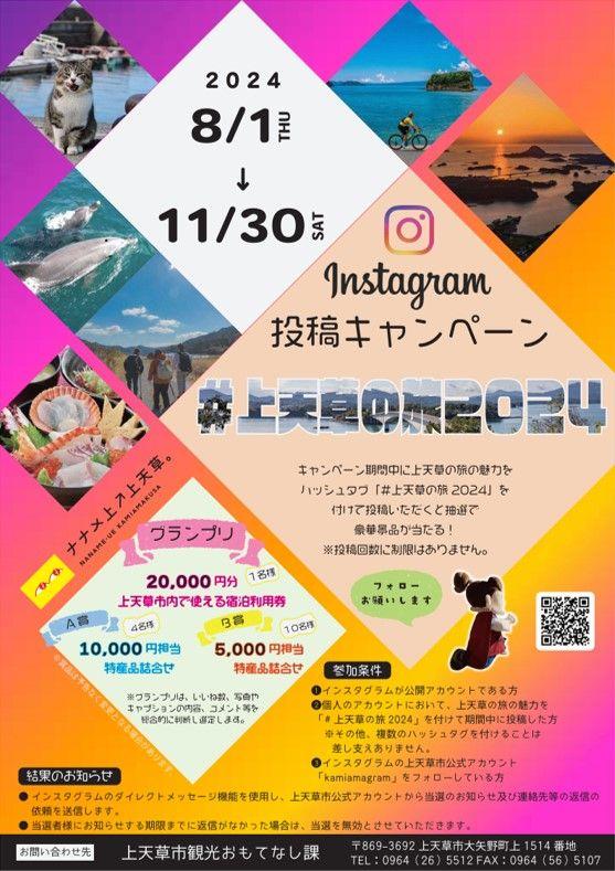 我们正在举办一项活动,只需在指定期间内在Instagram上发布带有专用标签“#上天草之旅2024”的旅行照片,就有机会抽取豪华奖品!