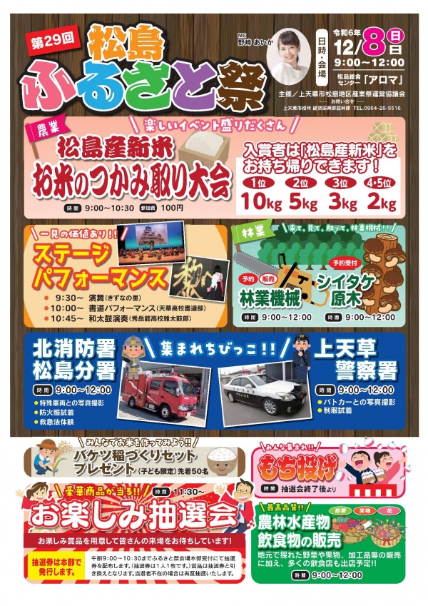为了提升第一次产业生产者的生产技术和生产积极性,并与生产者和当地居民共同分享对丰收的感恩之情,同时为上天草市的产业发展贡献力量,我们将举办第29届故乡祭。