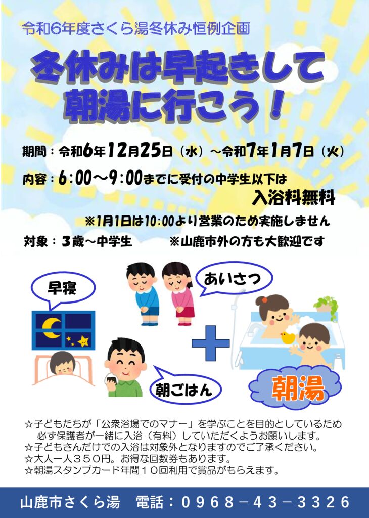 【山鹿市】冬休みは早起きして朝湯に行こう‼