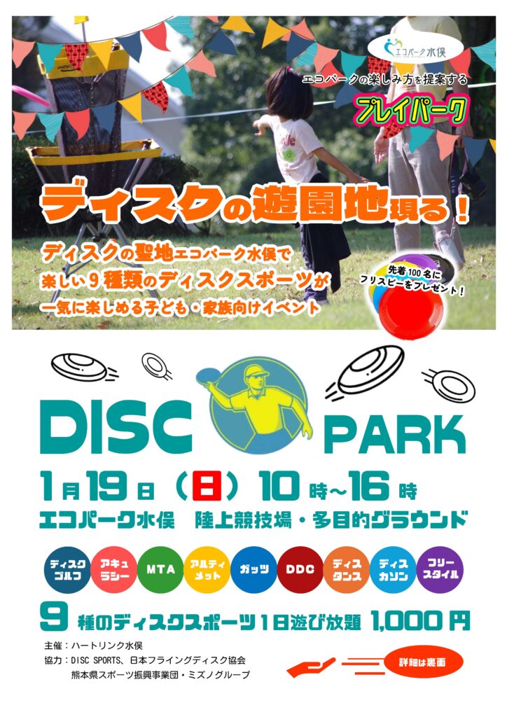 On January 19th (Sunday), the event “DISCPARK” will be held at Eco Park Minamata, aiming to make it a hub for disc sports.