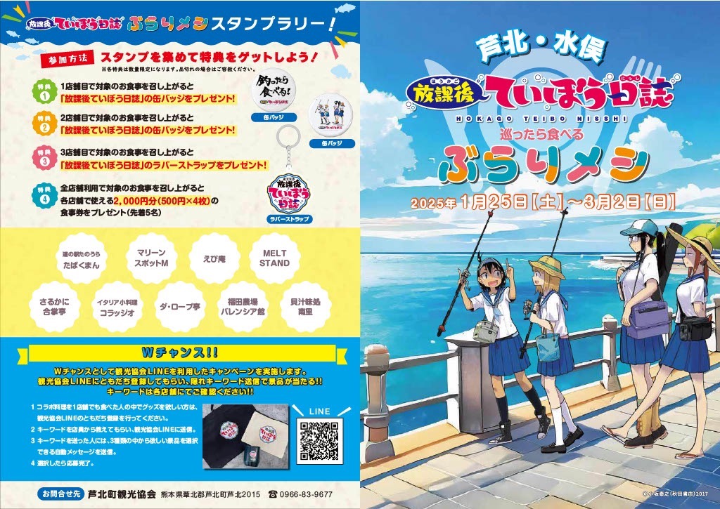 期間中、芦北町をモデルにした「放課後ていぼう日誌」とコラボレーションしたお食事を各店舗で注文し、スタンプを集めると、スタンプ数に応じてオリジナル缶バッジやラバーストラップをプレゼント!