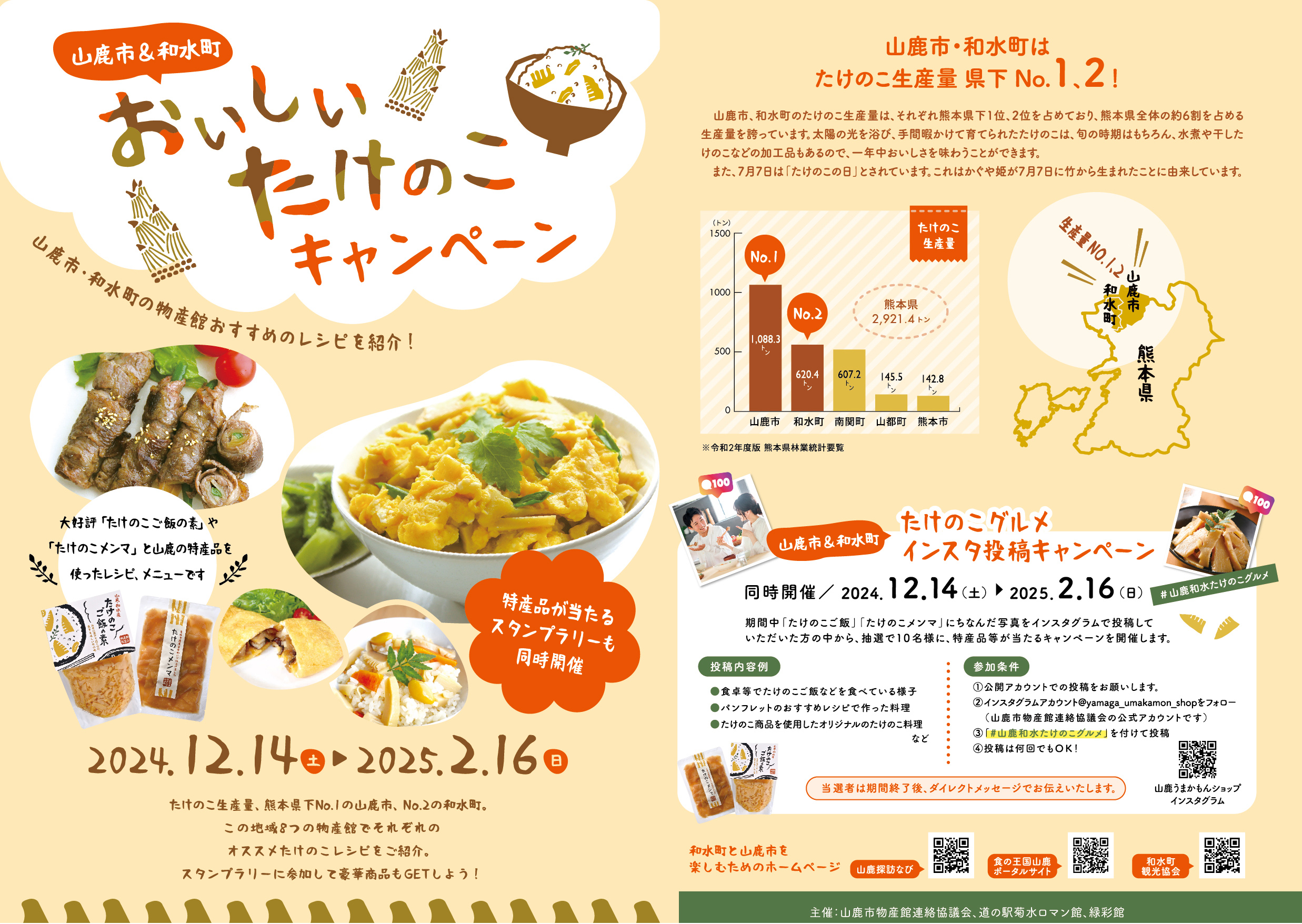 「たけのこご飯」や「たけのこメンマ」に関する写真をインスタグラムに投稿し、「#山鹿和水たけのこグルメ」を付けると、抽選で10名様に特産品が当たるチャンス!