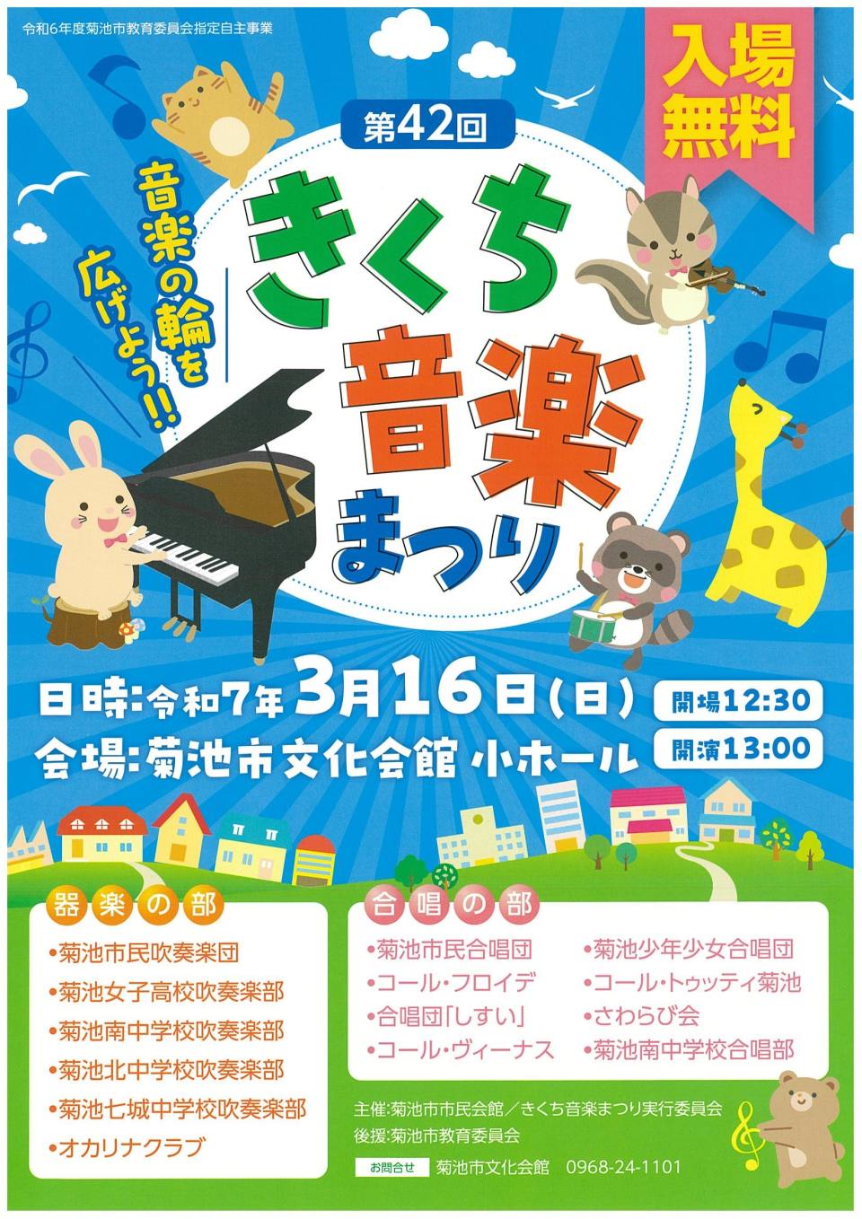 令和6年度菊池市教育委員会指定自主事業として、第42回きくち音楽まつりが菊池市文化会館小ホールにて開催されます。
