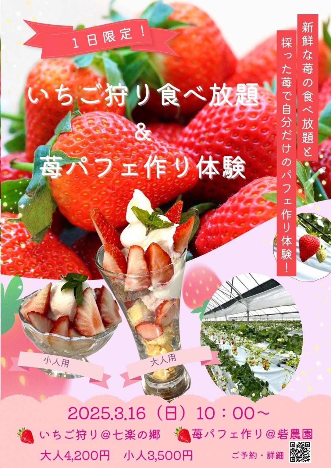 3月16日(日)、道の駅・七城メロンドーム裏の「七楽の郷」で、いちご狩り(食べ放題)と自分で摘んだ苺でパフェ作りが楽しめる特別なイベントが開催されます!