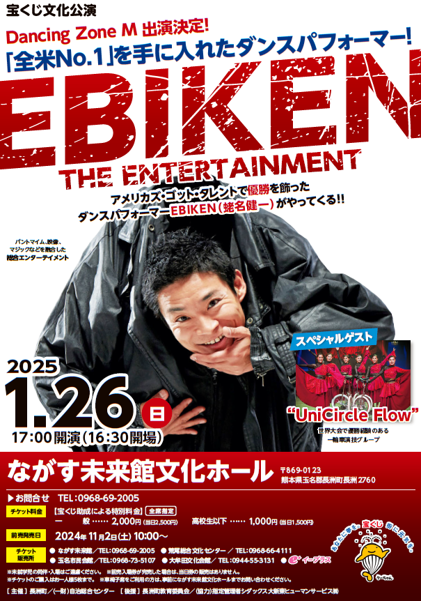 Dance performer EBIKEN (Kenichi Ebina), who captivated the world with his victory on America’s Got Talent, is coming to the Nagasu Mirai-kan Cultural Hall!