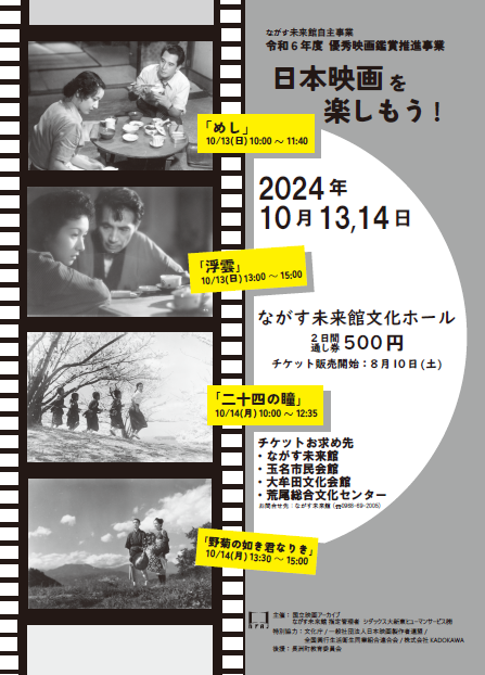 ながす未来館文化ホールにて、日本映画の名作上映会が開催されます。