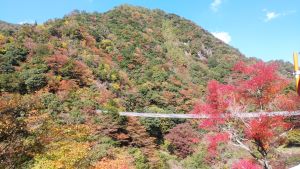 秋になると、周囲の山々が赤や黄色に染まり、吊橋からの眺めは圧巻です。