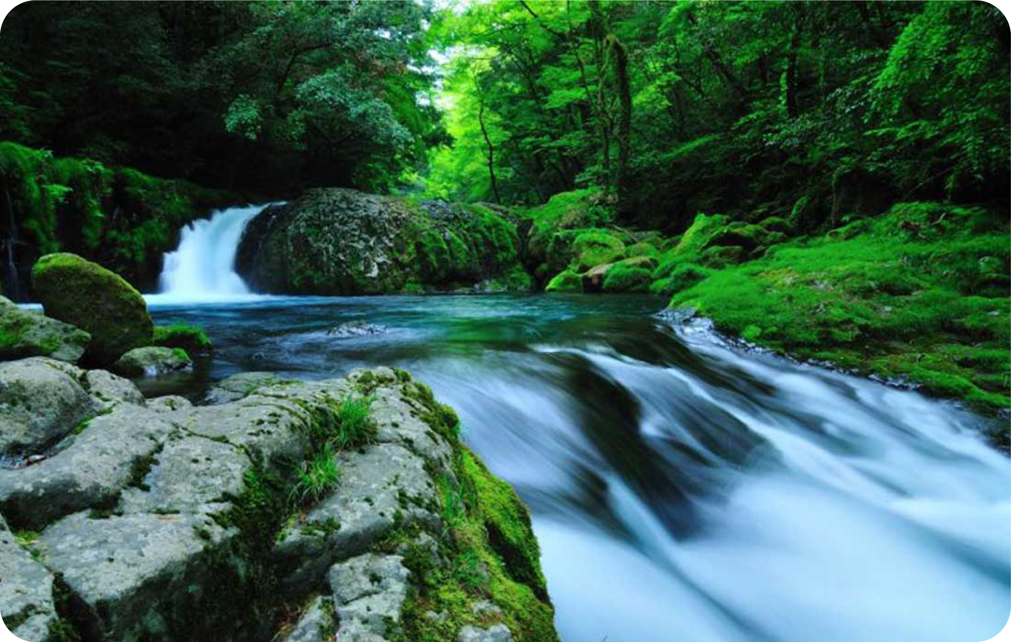 渓谷内には、うっそうとした広葉樹の森が広がり、その間を流れる清流が大小の瀬や淵、滝を作り出しています。